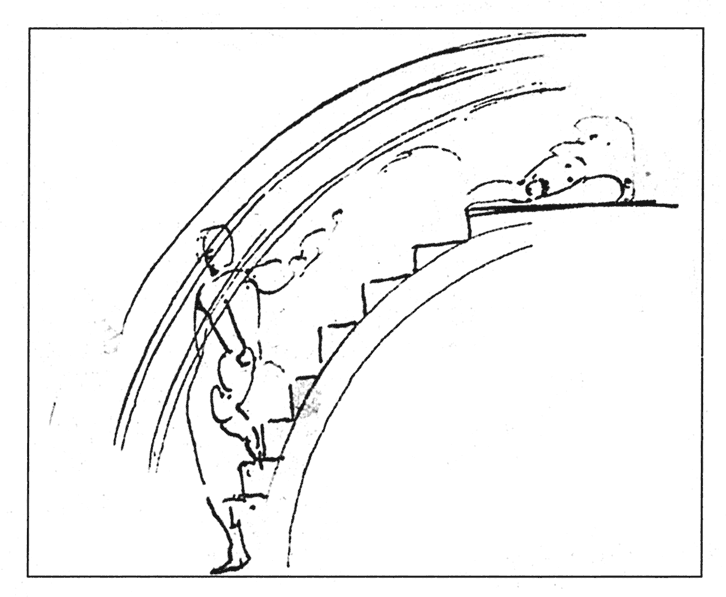 Для Микеланджело этот далекий от реальности проект лишь в очередной раз подтвердил несостоятельность архитектора. Возразив Юлию, что идея Браманте неосуществима, художник услышал в ответ, что он может сам выстроить леса, какие считает нужным. И вот в разгар подготовки, когда так много предстояло предусмотреть, Микеланджело пришлось решать задачу по конструированию помоста.