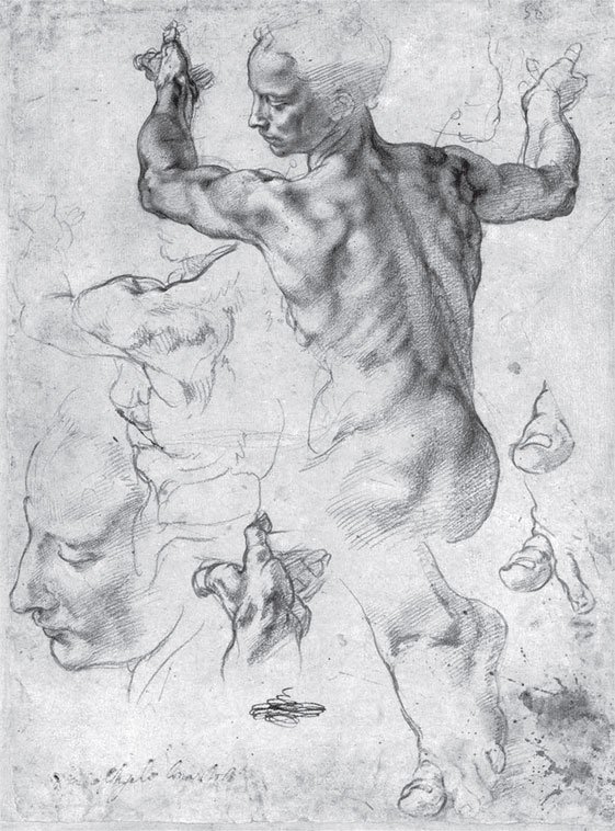 Эскизы плафона, из которых до нас дошли меньше семидесяти, выполнялись в самой разной технике, в том числе серебряным карандашом. Этот способ Микеланджело освоил в мастерской Гирландайо: он предполагает рисование стилусом по бумаге, обработанной несколькими тонкими слоями свинцовых белил и костяной муки (из столовых отходов), которые смешивали и связывали клеем. На шероховатой поверхности листа стилус оставлял мельчайшие частицы серебра, которые быстро окислялись, и проявлялись тонкие серые линии. Техника была медленной и требовала точности, поэтому для более скорых набросков Микеланджело использовал уголь и бистр – бурый краситель, который готовили на основе сажи и накладывали пером или кистью. Были также рисунки красным мелом, или сангиной, – эту технику впервые опробовал в предыдущем десятилетии Леонардо да Винчи в эскизах фигур апостолов в «Тайной вечере». Деликатный материал идеально подходил для небольших, детально проработанных рисунков: выразительные градации его теплых тонов позволяли Леонардо эффектно оттенять лица апостолов, а Микеланджело с той же блистательной виртуозностью будет передавать в спектре оттенков анатомически безупречные сплетения мышц.