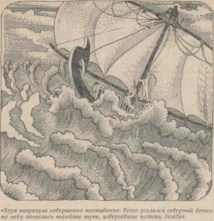 …Чудовищный ураган продолжался двое суток. В короткий перерыв затишья, начавшийся внезапно и так же кончившийся – бывалые мореходы называли его око бури, – кормчий поднялся на палубу, но не возвратился. То ли его смыло неожиданной волной, то ли схватили морские чудовища, поднявшиеся из глубины, – никто не знал, да, по правде сказать, особенно и не заботился.