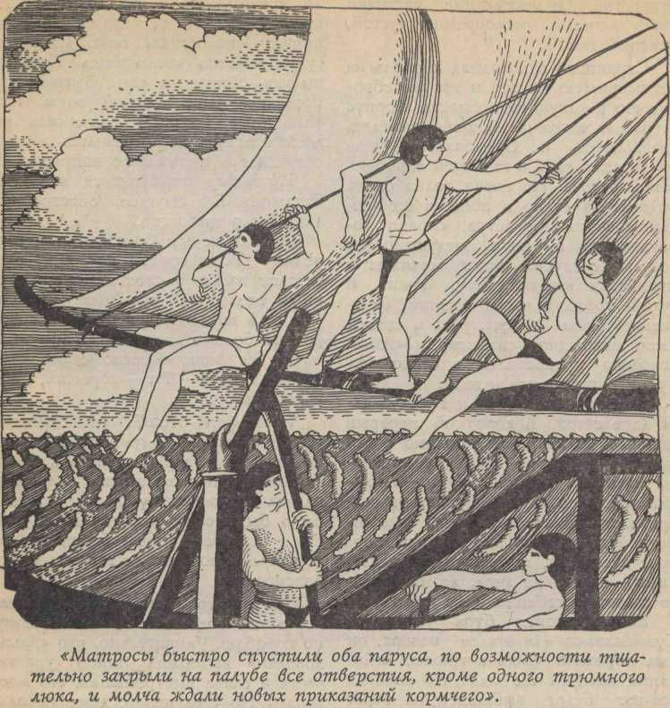 Матросы быстро спустили оба паруса, по возможности тщательно закрыли на палубе все отверстия, кроме одного трюмного люка, и молча ждали новых приказаний кормчего. Но он, казалось, забыл обо всём, он стоял на носу судна и задумчиво глядел вдаль.