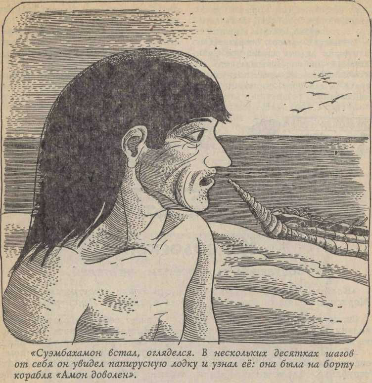 В нескольких десятках шагов от себя он увидел папирусную лодку и узнал её: она была на борту корабля «Амон доволен». Теперь в его сознании всплыло и воспоминание, что он из неё выполз к реке. Значит, на ней приплыл он к этому незнакомому берегу. Египтянин невольно взглянул на океан, ища корабль. Но поверхность океана была совершенно пустынна.