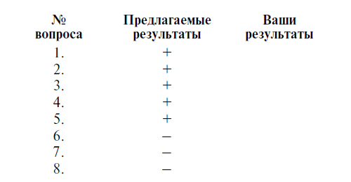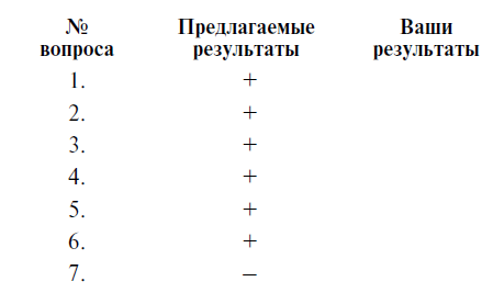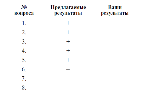 ОБРАБОТКА ТЕСТА. Вам необходимо подсчитать плюсы и минусы по следующей схеме: если ваш знак совпадает с предлагаемым в приведенной ниже таблице, – ставьте себе 1 балл.