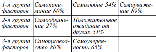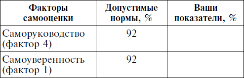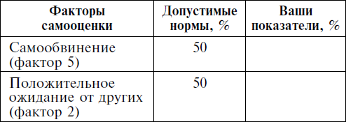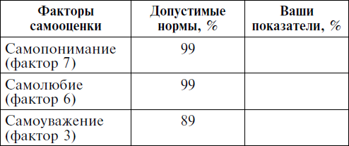 Теперь возьмите итоговые показатели по всем семи шкалам самооценки. Найдите ваше число в представленных процентных соотношениях и соответствующий вашему числу процент. Внесите в таблицу, которая покажет вашу самооценку.