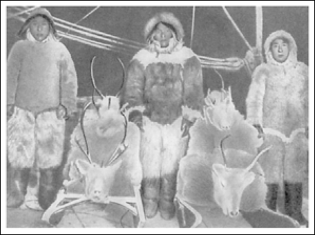 Когда мы подъехали, охотники стояли подле добычи, терпеливо ожидая нас. Я просил их не трогать оленя, так как хотел сделать несколько снимков. Это был красавец зверь, почти белоснежный, с великолепными ветвистыми рогами. Как только я сфотографировал оленя, эскимосы вчетвером принялись свежевать и разделывать его.