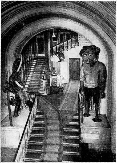 Распахнем парадный вход музея на Таможенном переулке и войдем в вестибюль. Справа над лестницей возвышается гигантская скульптура Ракшаса – "духа пожирателя людей", привезенная с острова Цейлон, слева – фантастическое сочетание тигра, носорога, слона, какого-то чудища, леопарда, обезьяны – это бог охоты горных племен Вьетнама. Прибыл он в музей из тропических джунглей Индокитая. На площадке первого этажа слоны из перегородчатой эмали – курильницы восточноазиатского происхождения и почти до самой крыши – тотемный столб – столб предков с берегов Амура. Вдоль лестницы, которая ведет на третий этаж музейной пристройки к Кунсткамере, в настенных витринах – натюрморты и картины из фарфора, эмали, стекла и лака китайских мастеров, среднеазиатские ковры. Знаменитые "каменные бабы" из алтайских и приволжских степей стоят в углах лестничных пролетов.