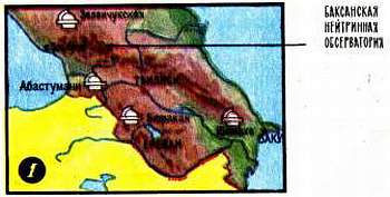Кавказ можно смело назвать форпостом нашей астрофизики, здесь находятся четыре крупные обсерватории мирового класса (рис. 1 на втором листе цветной вклейки): три из них – в Абастумани, Бюракане и Шемахе – входят в состав республиканских академий Грузии, Армении и Азербайджана, а четвертая – в районе станицы Зеленчукской – Специальная астрофизическая обсерватория АН СССР с крупнейшим в мире оптическим телескопом БТА и огромным радиотелескопом РАТАН (о них рассказывается в очерке «На старт выходят чемпионы», с. 85). Сейчас на Северном Кавказе, в Кабардино-Балкарии, создается гигантский астрофизический комплекс Института ядерных исследований АН СССР. Для этого комплекса в отрогах Эльбруса сооружается тоннель, который должен в итоге привести исследователей в скрытые от нас пока недра звезд и прежде всего к центру нашей собственной звезды, к центру Солнца.