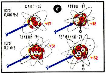 В галлиево-германиевом детекторе (его предложили и обосновали советские физики) в принципе происходит то же, что и в хлор-аргоновом: нейтрино превращает атом галлия-71 в атом германия-71 обычным своим приемом – превратив один из нейтронов атомного ядра в протон, т. е. увеличив на единицу положительный заряд ядра (рис. 6); германий-71 выделяют подобно тому, как раньше выделяли аргон; подсчитывают все атомы германия и узнают таким образом число пойманных нейтрино. Но вот что очень важно – порог «срабатывания» у галлия примерно 0,2 МэВ, т. е. значительно ниже, чем у хлора. И практически все виды солнечных нейтрино, в том числе и нейтрино от рр-реакции, могут быть зарегистрированы галлиево-германиевым детектором – лишь несколько человек в мире могут перепрыгнуть через двухметровый барьер, но перешагнуть через полуметровый барьерчик сумеет любой из нас. Очень может быть, что именно этот инструмент внесет ясность в нынешнюю, мягко говоря, запутанную картину солнечных циклов.
