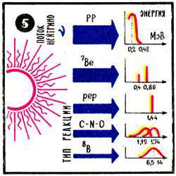 Теперь о самом, пожалуй, главном недосмотре сторонников второго солнечного кризиса: эксперименты Девиса ни в коем случае нельзя отнести ко всему комплексу солнечных циклов, так как многие нейтрино в этих экспериментах в принципе не могли быть обнаружены. Солнечные нейтрино рождаются в нескольких ядерных превращениях (рис. 5).