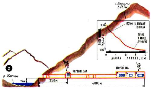 Уникальное сооружение нейтринной астрофизики создается в нашей стране на Северном Кавказе – в долине реки Баксан строится крупная многоцелевая нейтринная обсерватория Института ядерных исследований АН СССР, для нее сооружается четырехкилометровый горизонтальный тоннель с большими лабораторными залами.