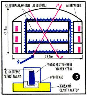 Осмотрев входные тоннели и вспомогательные помещения (обсерватория– это не только научные приборы, это еще и системы энергоснабжения, искусственного холода, отопления, вентиляции, обработки данных, транспорта, связи, пожарной безопасности), мы попадаем в первый лабораторный зал. Это владения огромной многоэтажной установки для регистрации космических мю-мезонов высоких энергий и некоторых энергичных нейтрино. Каждый из 3200 детекторов установки (рис. 3) – это бак с жидким сцинтиллятором, в который неотрывно всматривается электронный глаз ФЭУ – фотоэлектронного умножителя. Под действием прорвавшейся в детектор частицы в нем может произойти событие, так физики называют интересующую их ядерную реакцию. В веществе сцинтиллятора событие вызовет слабую световую вспышку, вспышку заметит ФЭУ и выдаст электрический импульс в систему регистрации; если частица прошьет несколько детекторов, то можно будет определить, откуда она пришла и с какой скоростью. Этот гигантский сцинтилляционный телескоп будет участвовать в целом комплексе астрофизических исследований.