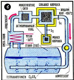 На действующей модели видны все основные этапы извлечения атомов аргона (рис. 4): тетрахлорэтилен продувается гелием и из бака выходит смесь газов; в нее входят и единичные атомы аргона-37, образовавшиеся из хлора под действием нейтрино; для начала смесь газов охлаждают, тетрахлорэтилен конденсируется и возвращается обратно в бак; оставшиеся газы дополнительно очищаются, проходя через молекулярное сито; затем все инертные газы собирают в большую ловушку из активированного угля; сравнительно маленькие атомы гелия беспрепятственно проходят через ловушку и возвращаются обратно в бак. Это уже физика плюс экономика. После нескольких недель экспонирования, нескольких часов продувки систему на короткое время перекрывает заслонкой 31 и перегоняют смесь газов в малую ловушку, а ее переносят в другую установку; здесь хромотографическая колонка отделяет аргон от других инертных газов, а титановый фильтр окончательно очищает его; аргон-37 – элемент неустойчивый, он постепенно распадается, и каждый распад регистрируется сверхчувствительным счетчиком; чтобы исключить ложные срабатывания счетчика, его защищают массивными металлическими экранами и, кроме того, окружают сцинтилляционными счетчиками. Если они срабатывают одновременно с основным, значит, событие вызвано какой-то внешней помехой и импульс не засчитывается. Импульс засчитывается только в том случае, если при срабатывании основного счетчика остальные молчат. Это значит, что срабатывание вызвано не внешним, а внутренним событием – распадом аргона.