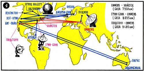 – В 1976 г. с участием советских исследователей было проведено семь циклов наблюдений на межконтинентальных радиоинтерферометрах. Это уже традиционные, плановые работы – они велись и раньше, будут проводиться в будущем. Первая работа 1976 г. (она длилась непрерывно более суток) прошла в феврале. В этот раз в интерферометр входили два радиотелескопа: в Хайстеке (район Бостона, США) и в Симеизе, в Крыму. Такие же циклы наблюдений были проведены в апреле и мае, но здесь уже работали радиотелескопы, расположенные в четырех точках планеты: в Тидбинбилле (Австралия, район Сиднея), в Мэриленд-Пойнте (район Вашингтона), в Биг-Пайн (вблизи Пасадены, США) и опять же в Симеизе. И наконец, пять циклов наблюдения по нескольку суток каждый (в июне, ноябре и декабре) с участием телескопов вблизи Бонна, в Хайстеке и Симеизе. Сезон 1977 г. в феврале открыл интерферометр Бонн – Симеиз – Онсала (Швеция).