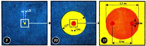 Квазары долгое время представлялись этакими гигантскими полыхающими шарами с угловыми размерами в десятки и сотни миллисекунд (рис. 9). Напомним, что размеры, указанные в угловых единицах, – это есть тот телесный угол, в котором объект виден с Земли; так, например, размер Луны – 8 угловых градусов, Марса – 0,2 градуса. Чтобы перейти от угловых размеров к линейным, нужно знать расстояние до объекта. А оно не всегда известно достаточно точно, и астрономы характеризуют объект величиной, которую знают наверняка, – его угловым размером.