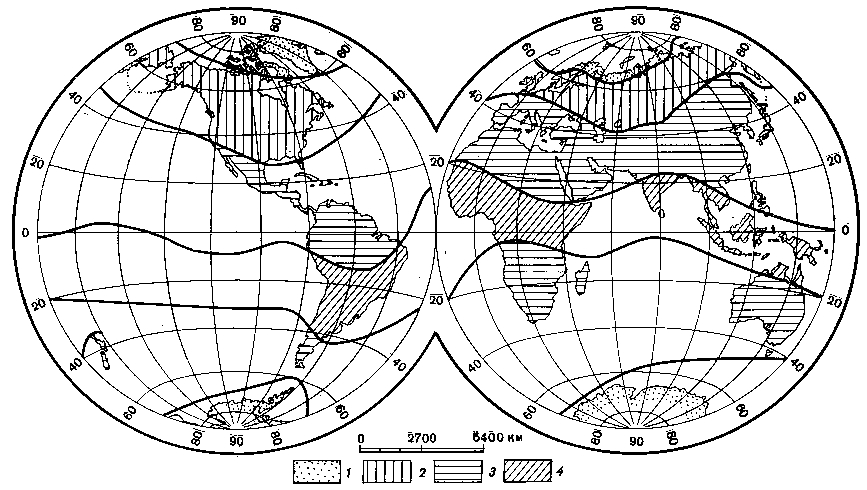 1 – центрально-ледниковая; 2 – периферического оледенения и переходная; 3 – субтропическая; 4 – экваториальная