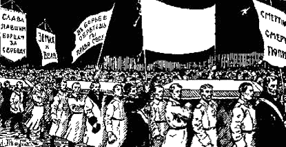 «Сегодня с утра огромные, нескончаемые шествия с военными оркестрами во главе, пестря черными знаменами, извивались п о городу, собрав по больницам д вести деся ть гробов, предназначенных для революционного апофеоза. По самому умеренному расчету, число манифестантов превышает девятьсот тысяч. А между тем ни в одном пункте по дороге не было беспорядка или опоздания. Все процессии соблюдали при своем образовании, в пути, при остановках, в своих песнях идеальный порядок. Несмотря на холодный ветер, я хотел видеть, как они будут проходить по Марсову полю. Под небом, закрытым снегом и разрываемым порывами ветра, эти бесчисленные толпы, которые медленно двигаются, эскортируя красные гробы, представляют зрелище необыкновенно величественное».