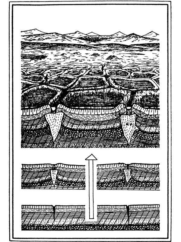 Впереди заболоченная западина. Ее плоское, как у блюдца, дно разбито на аккуратные прямоугольники (по краям блюдца они мельчают и теряют правильную форму). Будто кто-то плугом прошелся в двух направлениях. По обеим сторонам редких, но удивительно ровных борозд, оставленных неведомым пахарем, возвышаются валики.