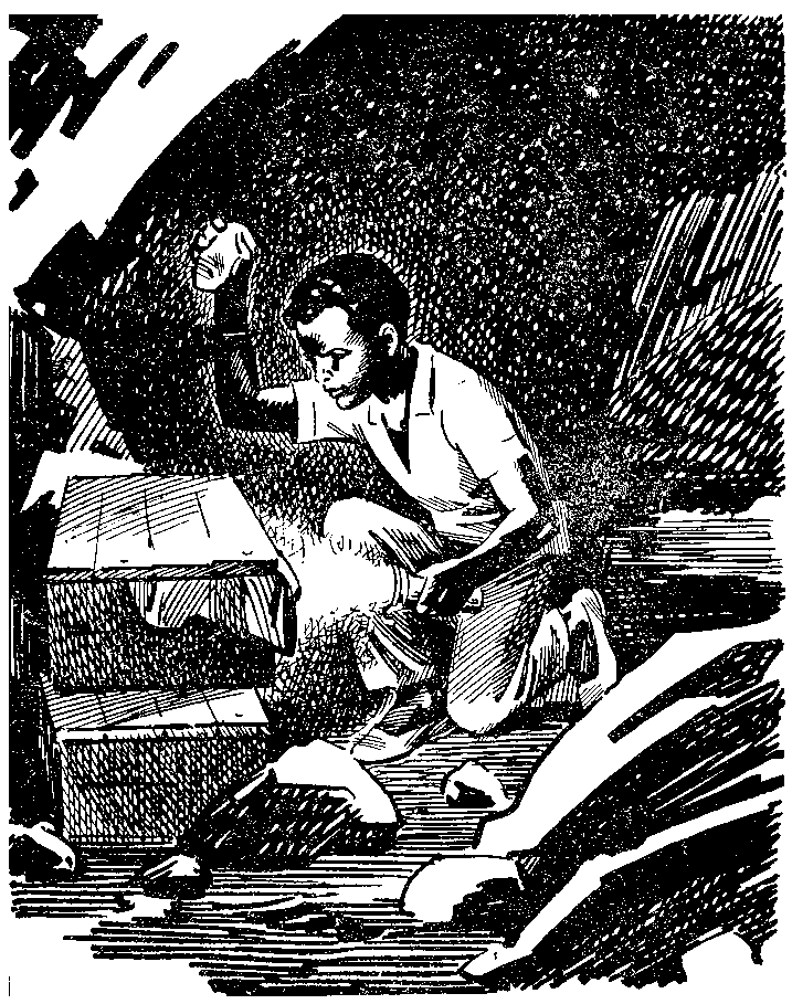 Він спробував відкрити ящики, та марно. Тоді Пако освітив ліхтариком навколо себе і помітив камінь. Підняв його і вдарив по ящику, що був зверху. Та камінь був над. то маленький, і він не зміг відірвати жодної дошки, лиш трохи сплющив дерево.