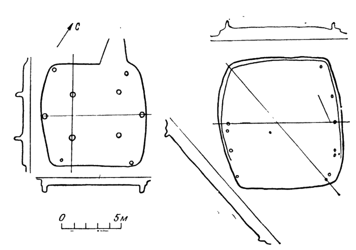 Рис. 21. Планы жилищ № 1 и 2 стоянки Онкороманай.