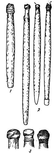 1 — из Сюэна; 2 – из могильника Касиваги; 3 — резные головки каменных палок.
