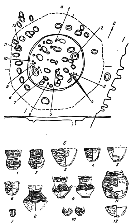 а – схема расположения находок керамики (1—12), б – типы глиняных сосудов, найденных в погребениях.