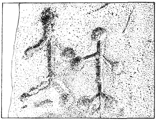 В одном месте на зеленовато-охристом фоне скалы видна группа человечков (рис. 27), изображенных в рост и как бы в ритме танца. У них большие круглые головы, руки раскинуты в стороны, динамично переданы ноги.