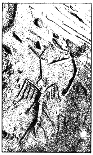 Еще интереснее группа антропоморфных фигур с выступающими из-за плеч руками-крыльями. По бокам «крыльев» видно нечто подобное бахроме-перьям. Перед нами какие-то полулюди-полуптицы (рис. 28), изображенные как будто в какой-то неистовой ритуальной пляске. Впечатление это еще больше усиливается при свете фонаря, когда по стенам пещеры начинают «бегать» тени, а сами фигуры колеблются в отсветах огня.