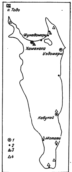 1 – постоянные поселения; 2 – сезонные стоянки; 3 – памятники культуры дзёмон; 4 – памятники охотской культуры