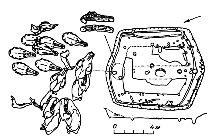 Сюрпризы ожидали археологов и при дальнейших раскопках. Оказалось, что место у дальней от входа стены, пс-видимому, предназначалось для свершения каких-то важных ритуальных церемоний, связанных с верованиями и представлениями людей охотской культуры. Именно здесь при расчистке пола открыли залежи медвежьих костей, среди них были и черепа медведей. В каждом жилище обязательно находили два-три медвежьих черепа (рис. 33).