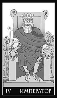 На карте изображен коронованный монарх – властный, величественный, восседающий на троне. Он олицетворяет правление, осуществление, власть мира сего, закон. Он представляет мужскую силу и мощь. Необходимость защищаться от любого постороннего влияния заставляет императора постоянно носить латы. Его скипетр имеет форму египетского символа жизни – анха, в левой руке императора – держава. Каменный трон символизирует незыблемость, прагматичность. Ту самую истину, которая подвергает сомнению все возвышенные идеалы, выясняя их полезность и эффективность. Баран (овен) – символ внутренней силы, помогающей нам достигать своих целей.