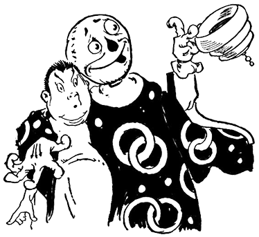 Жареные мыши, тушеные акульи плавники и суп из птичьих гнезд заставили его вытаращить глаза от удивления. Пугало приказал, чтобы Бума посадили рядом с ним, и единственным удовольствием, которое он получил от этого пира, было наблюдать, как этот толстячок с удовольствием орудует своими серебряными палочками для еды и фарфоровой ложкой.