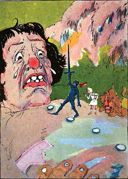 Великан лежал на спине. Он был такой огромный, что Дороти могла рассмотреть только его ноги до пояса. Трусливый Лев все еще висел на его ноге, вонзив в нее свои клыки. При этом он драл ее своими задними лапами и невнятно выкрикивал какие-то угрозы.