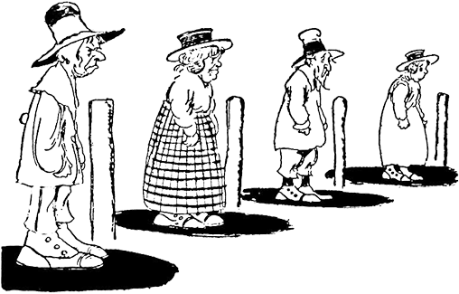 Все трое начали тихо подкрадываться к накрытым столам. При этом им на глаза то и дело попадались другие не менее любопытные обитатели Фикстауна. Мимо них лихо пронеслись несколько стульев, прошествовал диван и проковыляла вешалка для одежды. Впрочем, Дороти позже рассказывала Озме, что после говорящих кустов их уже ничто не удивляло. Выстроившись гуськом, столы завернули за угол. Трое друзей последовали за ними. Зрелище, открывшееся Дороти и ее спутникам, было донельзя странным. По обеим сторонам длинной улицы, насколько хватало глаз, стояли ряды людей. Каждый житель находился точно в центре нарисованного мелом круга, и все горожане стояли настолько неподвижно, что Дороти даже подумалось, что это статуи.