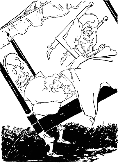 – Вперед! – скомандовал огромный фикс так решительно, что все трое подскочили. Крепко держась за руку сэра Рыцаря, Дороти ступила на кусок дороги, который уже успел развернуться перед ними. Трусливому Льву тоже было не по себе, но он последовал за ней. Не успели они это сделать, как дорога стремительно рванулась вперед, начав разматываться с рулона с ужасающей скоростью. Трое стоявших на ней друзей вцепились друг в друга, стремясь сохранить равновесие. По мере того, как дорога раскручивалась, по обеим ее сторонам вставали высокие деревья, которые лишь хихикали над тремя сбившимися в кучу путниками.