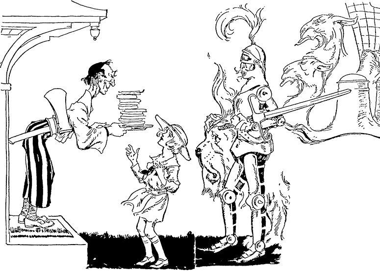 Юный барабанщик, хотя и не понимал ни слова из этой беседы, с большим интересом следил за ходом разговора. При этом он уже некоторое время пытался привлечь к себе внимание Пугалы, но сэр Рыцарь оказался единственным, кто это заметил.
