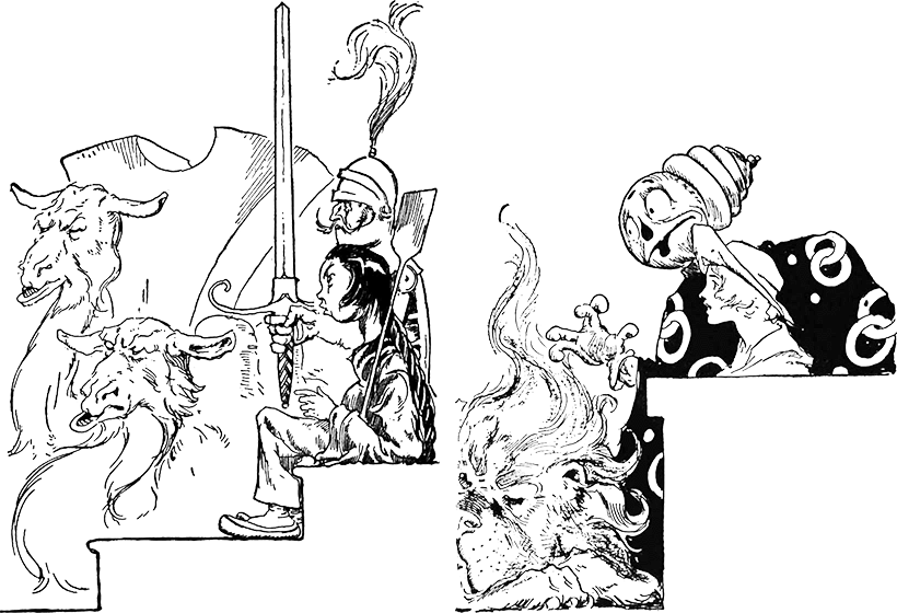 – Предательство! – прошипел старший принц, обращаясь к двум прочим. – Мы же приказали привязать его к бобовому стеблю! За этим Пугалом нужен глаз да глаз! И кто эти странные создания, которые сгрудились вокруг него, скажите на милость?