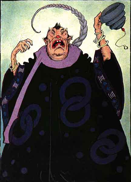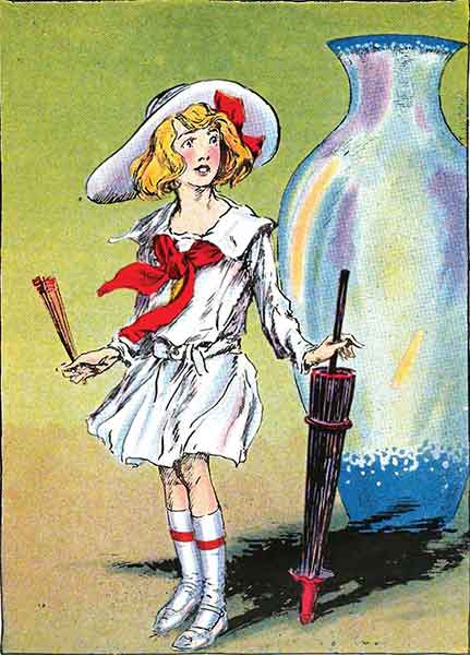 Пугало услужливо протянул веер и зонтик Дороти. Увидав их, юный барабанщик так сильно задрожал от страха, что скатился со ступеней трона.
