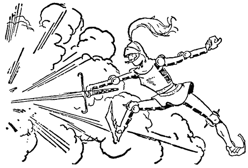 Пугало так разволновался, что потерял равновесие и рухнул вниз. При этом во время падения он умудрился налететь на шлем сэра Рыцаря и чуть было не своротил ему забрало. Остальные стали поспешно спускаться и вскоре снова оказались у основания бобового стебля.