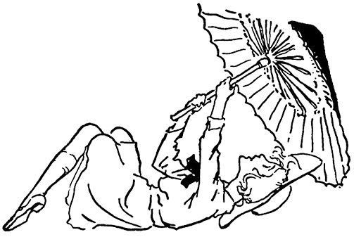 Тот в ответ широко улыбнулся и, покопавшись в глубоком кармане своего облачения, выудил оттуда маленький веер и зонтик, который он сорвал с бобового стебля.