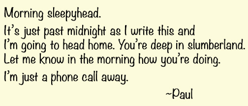 Back in the bedroom, I carefully remove her shoes, open the folded blanket at the foot of the bed, and drape it over her. I prop up my note on the bedside table so she’ll see it as soon as she wakes.