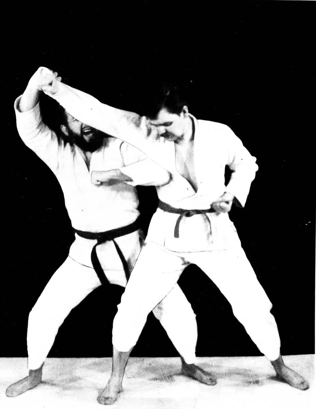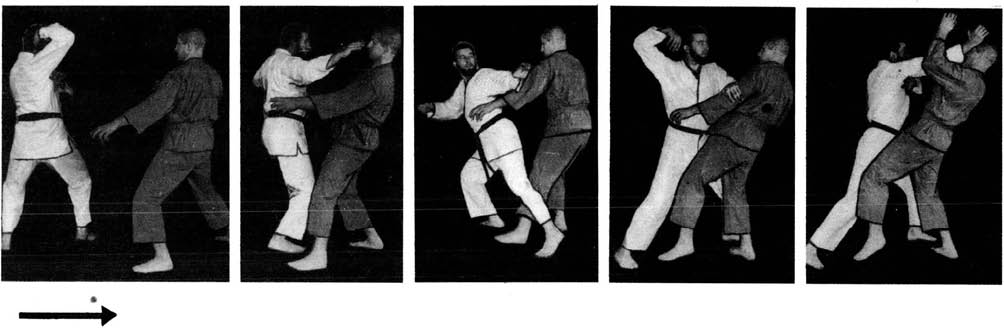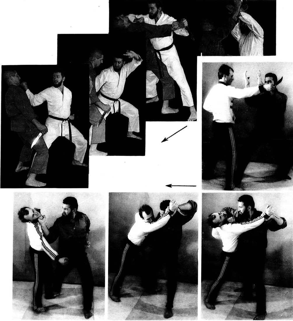 Даже если корпус совершенно неподвижен, всегда остаются возможности для нанесения ударов головой, коленями, ногами и пятками вперед и назад, в сторону, в колено, в пах, и т. д. Первый удар очень часто приносит победу, если не физическую (нокаут, болевой шок, ослабление захвата), то психологическую, так как ваши решительные действия могут заставить противника отказаться от дальнейшего ведения боя.