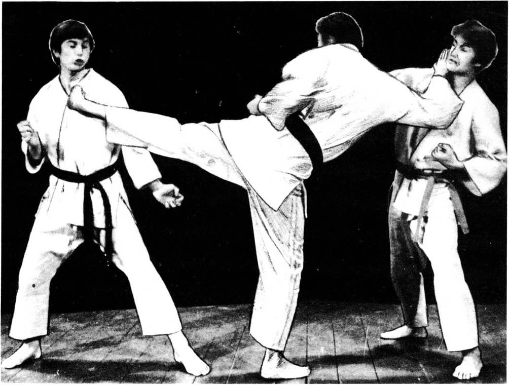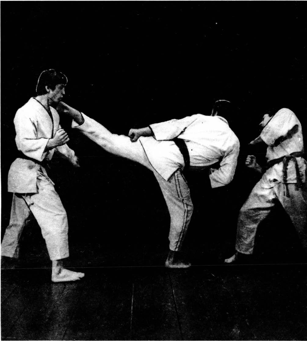 Теперь, допустим, бой происходит в небольшом помещении, где много противников. Наиболее выгодно в этой ситуации принять оптимально низкую стойку и короткими ударами типа "эмпи-учи" и "ура-дзуки" свалить ближайших противников на землю. Теперь пришла очередь применять удары ногами по расширяющейся окружности, чередуя их с ударами рук. Старайтесь ногами не бить выше живота, а больше наносите ударов по коленным суставам и в пах, одновременно атакуя лицо соперника руками.
