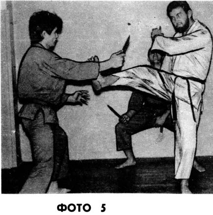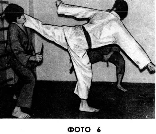 Если рука с ножом находится на полпути к вам, отбейте ее ударом "микадзуки-гери" /5/ с добавлением "ура маваши-гери" в лицо другой ногой /6/.