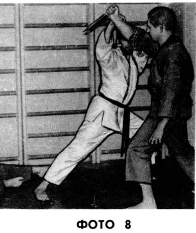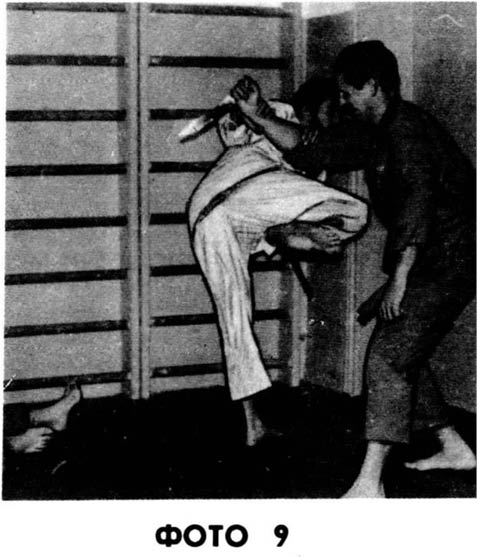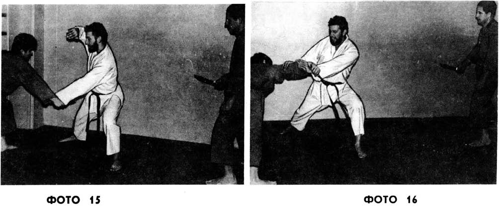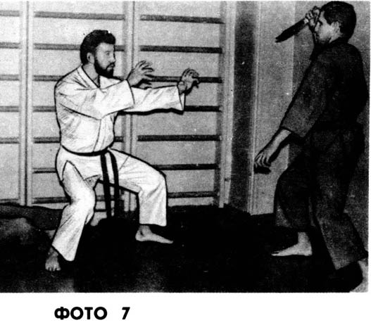 При атаке ножом снизу сделайте уклон в сторону, отбив удар отметающим блоком предплечья по типу "гедан-барай" и ударом "шотэй-учи" выше локтевого сустава /15, 16/.