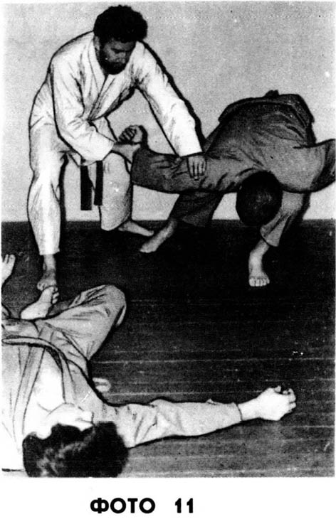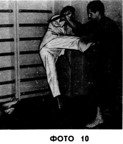 Атаку ножом сверху /7/ можно отразить блоком двумя предплечьями снаружи вовнутрь /8/ с контратакой коленом или "маваши-гери" в живот /9, 10/. Завершить атаку можно болевым приемом на локтевой сустав противника /11/.