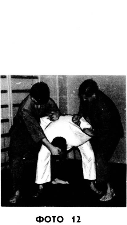 От захвата с загибом рук за спину /12/ можно освободиться при помощи ударов ногами по коленам /13, 14/ с последующим продолжением атаки ударами "мае-гери" или "маваши-гери".