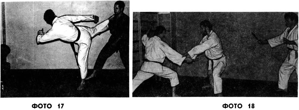Сделав уклон в сторону, встретьте удар ножом снизу встречным ударом "уширо-гери" в лицо противника /17/.