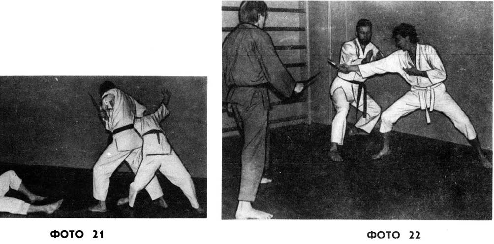 Атаку ножом прямо от груди встречайте уходом в сторону с одновременным блоком атакующей руки ребрами обеих рук /20, 22/, захватом за шею и броском "задняя подножка" /21/, или ударом локтя в лицо /23/.