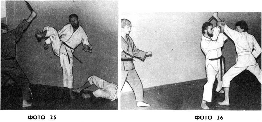 Сделав отвлекающее движение руками в сторону, отбейте атаку ножом сбоку ударом "мае-гери" или "маваши-гери" /24, 25/.