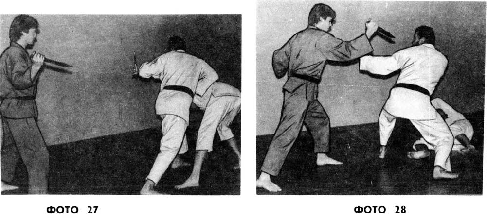 Перехватив удар ножом сверху двумя руками /26/, нанесите удар локтем в бок противника /27/.
