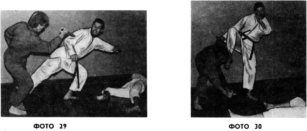 Сбейте противника, бьющего ножом сзади обратной подсечкой пяткой ноги /28, 29/ и завершите атаку ударом подъемом стопы в лицо /30/.